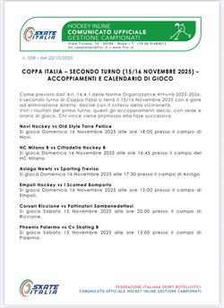 Negli altri abbinamenti il Novi ospiterà il Torrepellice, l’Empoli se la vedrà con il Bomporto, i Corsari Riccione ospiteranno i Pattinatori Sanbenedettesi ed infine i Phoenix Palermo (la squadra che ci sarebbe piaciuto incontrare) giocherà contro il CV Skating B.